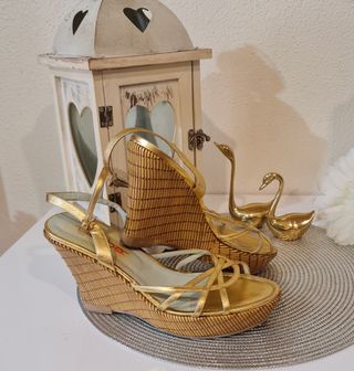 Sandalias con Cuña de Piel en color Dorado. Diseño de Pilsera en Tobillo. *Número 40. *Medidas: Peep-Toe delante 3'5 cms Altura Cuña 10 cms. *Como se observa en la foto con las Flechas en color verde tiene dos pequeños defectos del uso. Pero están en Perfecto Estado.