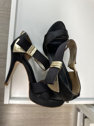 Sandalias de tacón negras con detalles dorados. Son elegantes y parecen estar en buen estado. - Tacón alto. - Diseño de tiras. - Material tipo ante.