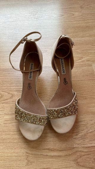 Sandalias tacon tonos beige y dorados. Marca Maria Mare