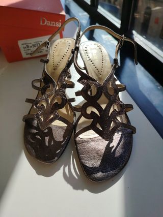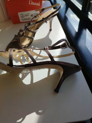 Preciosas sandalias de tacón de la marca Dansi, en color marrón dorado. Ideales para una ocasión especial. - Diseño elegante y sofisticado con detalles calados. - Tacón fino y cómodo. - Hebilla de cierre en el tobillo. - Se venden dos sandalias.