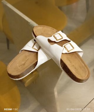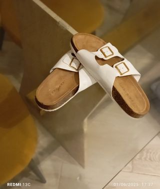 Sandalias blancas de Primark, ideales para el verano. Son elegantes y cómodas. - Diseño de doble hebilla dorada. - Suela de corcho. - Perfecto estado.