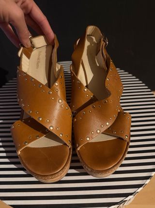 Sandalias de cuña de Michael Kors con un diseño de tiras entrelazadas y detalles metálicos. Están como nuevas porque apenas se han utilizado aunque las cuñas y las placas con el nombre de la marca tienen algunos rasguños. - Material exterior de cuero. - Detalle de tachuelas doradas. - Correa ajustable en el tobillo. - Suela de cuña de madera oscura. Más cosas en mi perfil.