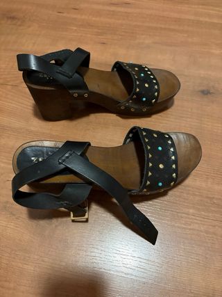 Sandalias de tacón con un diseño único. - Tira delantera con tachuelas doradas y detalles turquesa. - Tira de tobillo ajustable. - Tacón de madera.