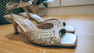Elegantes sandalias de tacón con un acabado metálico dorado. Perfectas para añadir un toque de brillo a tu atuendo. - Diseño de tiras. - Cierre con hebilla. - Tacón fino.