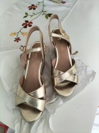 Sandalias de verano en color dorado, talla 37. Se encuentran en buen estado. - Diseño con tira al tobillo. - Detalle de esparto en la suela. - Cierre con hebilla.