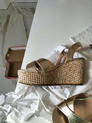 Elegantes sandalias doradas con diseño de cuña. - Tiras cruzadas en la parte delantera. - Correa ajustable al tobillo. - Detalle de purpurina en la cuña.