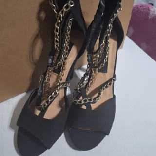 Elegantes tacones negros con un diseño de cadenas doradas que añaden un toque de glamour. - Diseño abierto en la punta. - Cadenas doradas decorativas. - Cierre de tira al tobillo.