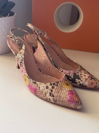 Elegantes tacones slingback con un llamativo estampado. - Diseño de serpiente con flores. - Tira ajustable en el talón. - Punta fina. - Tacón 9 cm - En piel - Suela en color fucsia. - Puestos en un evento, como nuevos.
