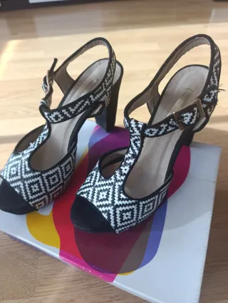 Sandalias de tacón con un diseño llamativo y moderno. - Estampado geométrico en blanco y negro. - Correa de tobillo ajustable con hebilla. - Tacón grueso para mayor comodidad y estilo. - Punta abierta.