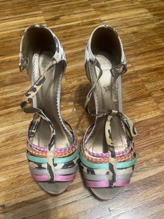 Tacones de verano con un diseño llamativo y original. - Estampado multicolor. - Plataforma y tacón de madera. - Correa ajustable al tobillo.