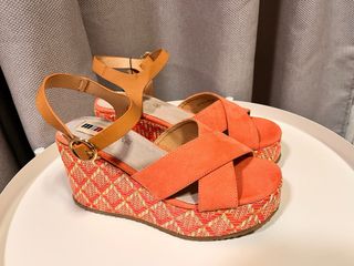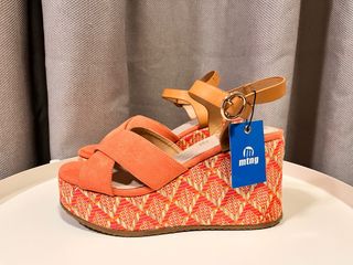 Sandalias de cuña de la marca Mustang, nuevas con etiqueta. - Diseño de tiras cruzadas en la pala. - Cuña con acabado textil estampado. - Cierre de hebilla. - Color naranja y multicolor.