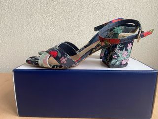 Sandalias de tacón con un diseño tejido floral muy llamativo y un tacón de 7 cm de altura. - Estampado floral multicolor sobre fondo azul marino. - Tira de tobillo con cierre de hebilla. - Tacón ancho y cómodo. Estado muy muy bueno.