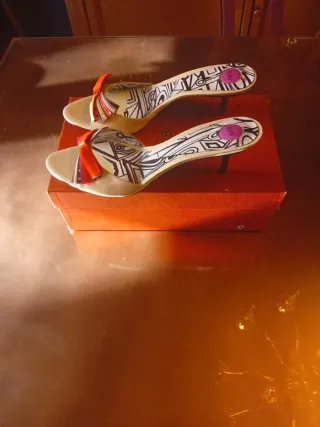 Elegantes sandalias de la marca Blay con un diseño llamativo. - Color beige con detalles en naranja y estampado interior. - Adorno de lazo en la parte delantera. - Tacón fino.