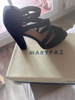 Preciosas sandalias de tacón de la marca MARYPAZ. Son de color negro y talla 38. Están en perfecto estado. - Diseño elegante y sofisticado. - Material brillante y de alta calidad. - Tacón cómodo y estable. - Perfectas para cualquier ocasión.solo venta en persona