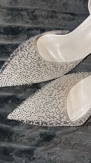 Elegantes tacones adornados con perlas y pedrería. - Diseño de punta fina. - Tira fina en el tobillo. - Tacón de altura media.
