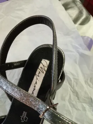 Elegantes tacones en color plateado. Perfectos para complementar cualquier atuendo. - Diseño con tiras cruzadas en la parte delantera. - Correa ajustable en el tobillo con hebilla. - Tacón de altura media.