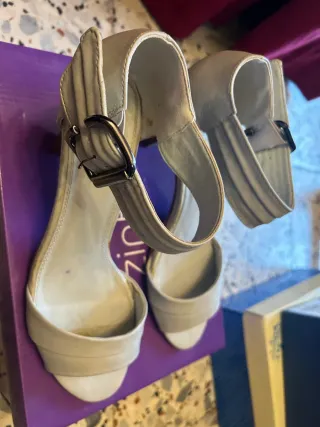 Talla 39 Sfera Collection Abiertas De grosor medio (tipo bloque fino). Altura aproximada: 7–9 cm Tiras cruzadas en el empeine. Pulsera al tobillo con hebilla metálica ajustable Exterior textil o ante sintético. Plantilla acolchada en tono rosa claro para mayor comodidad. Gris claro / perla. Estilo elegante y minimalista. Ideales para eventos, celebraciones, bodas, comuniones o looks de noche. Combinan bien con vestidos, faldas midi o pantalones de vestir. Como nuevas