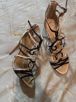 Elegantes sandalias de tacón con un diseño sofisticado, usadas una sola vez, están en perfecto estado, vienen con la caja original - Material principal: ante negro. - Tiras cruzadas en la parte delantera con ribete dorado. - Cierre de hebilla ajustable en el tobillo. - Plataforma delantera para mayor comodidad. - Tacón alto y fino.