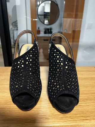Tacones negros básicos, ideales para el día a día. Son muy cómodos y versátiles. - Diseño de cuña. - Material exterior tipo ante.