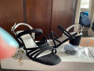 Sandalia de fiesta con tacón fino. Negra con pedrería. Usadas sólo en dos ocasiones Marca Argenta. Precio de compra 137€ Tengo más calzado en mi perfil. Acepto ofertas no irrisorias y hago descuento comprando varios.