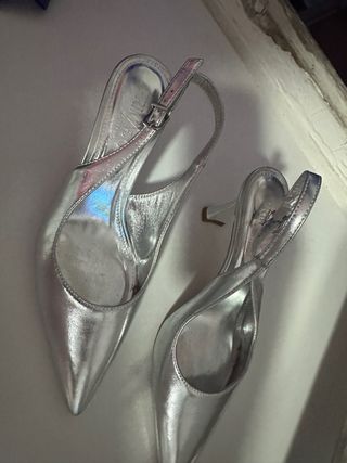 Elegantes tacones plateados con un diseño de punta fina. - Acabado metálico brillante. - Correa de tobillo ajustable. - Tacón de aguja. Usados una vez pero m opere el pie y no puedo usar tacones