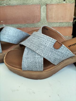 Sandalia zueco bandas plateadas, solo puesto un rato, no puedo usar por estar grandes