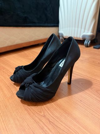 Elegantes tacones negros con un diseño peep toe. - Detalle de nudo (lazo) drapeado en la punta. - Tacón de aguja. - Material textil.