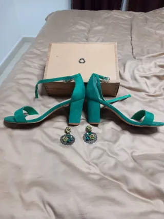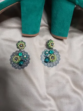 Elegante conjunto de zapatos de tacón y pendientes a juego. - Zapatos de tacón verde con correa al tobillo. - Pendientes decorativos con detalles verdes y dorados.