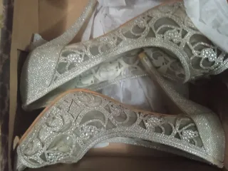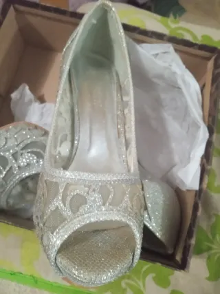 Elegantes tacones plateados con un diseño delicado y brillante. - Acabado con pedrería y detalles de encaje. - Diseño peep-toe.