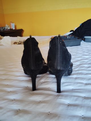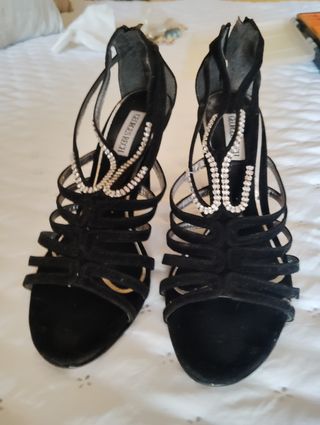 Preciosas sandalias de tacón de la marca George Rech. Son de color negro y tienen brillantes. Ideales para una ocasión especial. - Material: ante - Tacón alto - Cierre de cremallera - Dos pares de sandalias