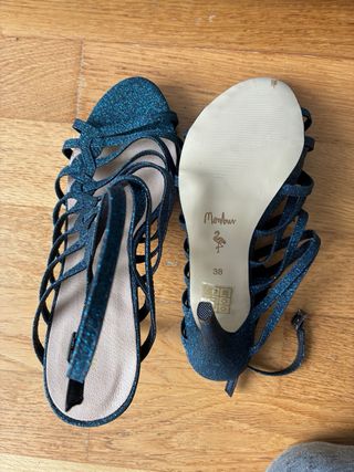 Elegantes sandalias plateadas con tacón, perfectas para ocasiones especiales. - Diseño abierto en la punta. - Tira ajustable en el tobillo. - Acabado brillante. Estan usadas tres veces, pero tienen algun desperfecto