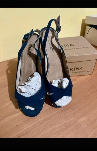 Sandalias con cuña de mujer en talla 36. En color azul marino. Marca corina Modelo 56847 884 / C4115 En su caja original.