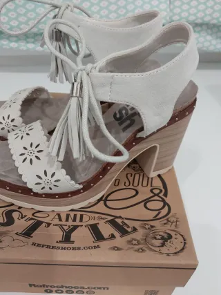 Sandalias de cuña de la marca Refresh. - Diseño con tiras y detalles de flores troqueladas. - Cierre con cordones y borlas. - Tacón de madera. - Suela con tachuelas decorativas.