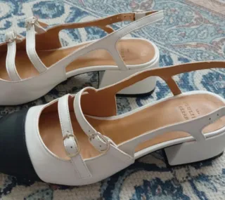 Elegantes sandalias de la marca Sezane, modelo Babies. - Diseño bicolor en blanco y negro. - Cierre con hebilla. - Tacón bajo cuadrado.