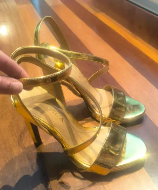 Sandalias de tacón fino color dorado. Son elegantes y estan en buen estado, aunque presentan algunos signos de uso. - Diseño de tiras con brillantes. - Cierre de hebilla en el tobillo. - Tacón fino y elegante.