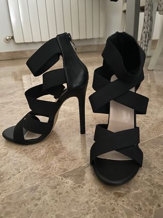 Sandalias de tacón alto, color negro. Son dos sandalias. Están usadas, pero en buen estado. - Tacón fino. - Diseño de tiras cruzadas. - Material: piel sintética.