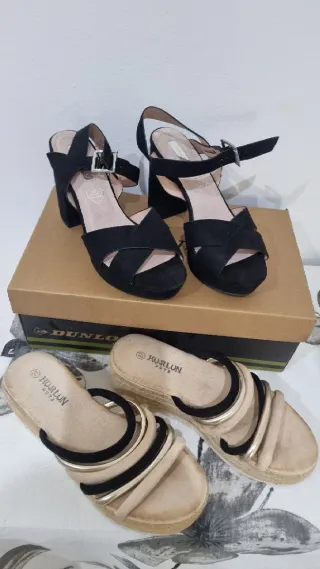Sandalias negras de tacón de la marca Mary Paz. Ideales para verano. - Son de ante. - Tienen cierre de hebilla en el tobillo. - Tacón fino. - Se venden dos pares.