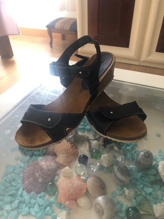 Sandalias negras de Gloria Ortiz hechas en España. Muy cómodas. La suela es lo único que se ve usado, lo demás tacón, plantilla y demás está en perfecto estado. Talla 35