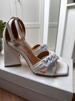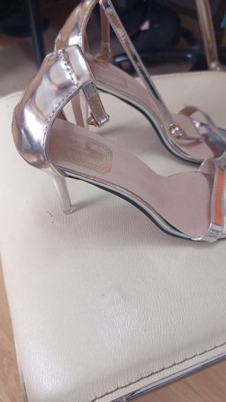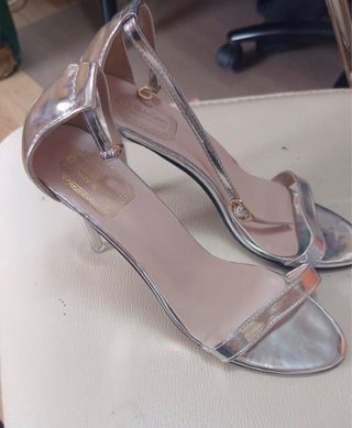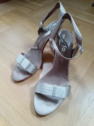 Elegantes sandalias de tacón, ideales para eventos especiales como bodas o fiestas. Perfectos para invitadas. - Talla 38-39. Es 39, pero justita. Lo veo más para 38 y medio. - Diseño con tiras y lazo brillante. La punta y el talón al descubierto. Pulsera ajustable en el tobillo. - Son de raso color champagne con detalles en brillo. Solo se han usado un rato en un evento. Tienen el cuero un poco marcado de estar guardado en la suela, no se ve al ponérselos. Revisar la última foto o preguntar.