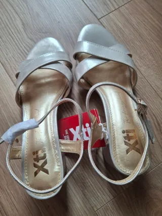 Sandalias de tacón con tiras cruzadas. - Diseño elegante en tonos dorados y plateados. - Cierre de hebilla. - Marca Xti.