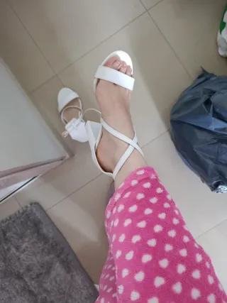 Elegantes sandalias de tacón con un diseño llamativo. - Tacón grueso con acabado brillante. - Tiras finas para un ajuste seguro. - Plataforma delantera para mayor comodidad. - Puestas solo una vez en una boda.