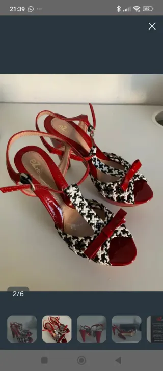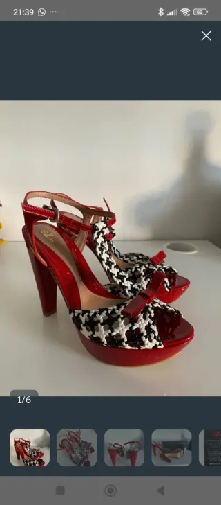 Elegantes zapatos de tacón con un diseño llamativo. - Tacón alto y plataforma. - Tiras ajustables en el tobillo. - Detalle de lazo en la puntera. - Combinación de charol rojo y tejido blanco y negro.
