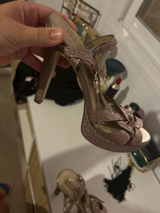Elegantes zapatos de tacón con un acabado brillante que captará todas las miradas. Perfectos para añadir un toque de glamour a cualquier atuendo. - Diseño con tiras y hebilla. - Tacón grueso y cómodo. - Acabado con purpurina. Nuevos a estrenar !! Para pues que no sean muy anchos