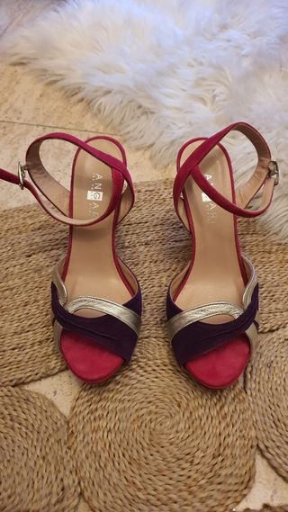 Sandalias de tacón número 39, en azul y rojo. Son de piel y tela, y tienen un diseño elegante y cómodo. - Material combinado: piel y tela. - Color: azul y rojo. - Talla: 39. Es un 38 pero equivale a una 39.