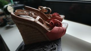 Sandalias de cuña en color salmón, perfectas para el verano. Están muy bien. El único fallo es la tira de adelante que ha perdido un poco de color al limpiarlas. Nada que no se solucione con betún de ese color. - Material textil. - Cierre de tira. - Cuña de esparto.