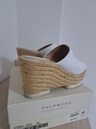 Preciosas sandalias de la marca PALOMITAS by Paloma Barceló. Son de color blanco y talla 40. - Diseño de cuña alta. - Material de piel. - Suela de esparto. - Están usadas pero aún son muy ponibles