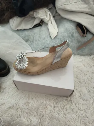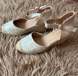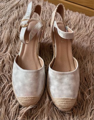 Sandalias de esparto con cuña, perfectas para un look veraniego. Muy cómodas. - Material exterior: ante sintético. - Color blanco plateado. - Detalle de esparto en la cuña y puntera. - Correa ajustable al tobillo con hebilla. - Forro interior textil. - Número 40, como nuevas, usadas en una ocasión.