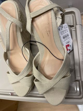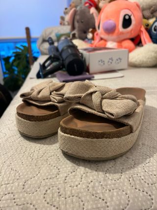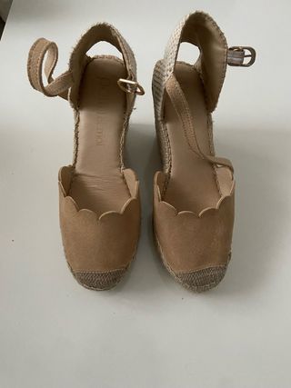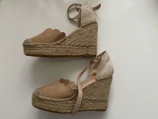 Sandalias de esparto con un diseño muy bonito. - Color beige. - Cierre con pulsera al tobillo. - Detalle de ondas en la pala. - Suela de esparto. Solo usadas una vez. Son muy cómodas, las vendo porque son demasiado altas para mí.