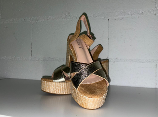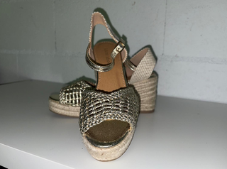 Elegantes tacones dorados con cuña de esparto. PRECIO ORIGINAL 26,95€, PRECIO EN REBAJAS (36%) 17€ - Talla 36. - Talla 39.