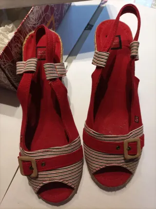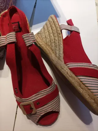 Sandalias rojas de cuña, sin estrenar. El material es ante. - Cierre con hebilla. - Diseño cruzado en la pala. - Suela de esparto.